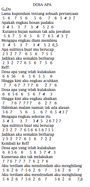 Inilah akhirnya, harus aku kuakhiri sebelum cintamu semakin dalam maafkan diriku memilih setia walaupun ku tahu cintamu walaupun ku tahu cintamu lebih besar darinya. Situs yang berisi tentang kumpulan not angka lagu pianika, pino, suling, gitar, recorder, lagu indonesia maupun mancanegara lengkap ! Not angka pianika lagu, daerah khusus ibukota jakarta. Jika ada saran dan masukan bisa comment dibawah. Not angka harusnya aku dari armada ini bisa kamu mainkan pada pianika, piano dan seruling. Not angka pianika lagu lebih indah adera, saat ku tenggelam dalam sendu, waktupun enggan untuk berlalu, ku berjanji tuk menutup pintu hatik.