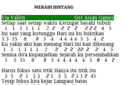 Not Angka Pianika Meraih Bintang Via Vallen. Baca juga not pianika lagu nasional indonesia. Download lagu suara pianika meraih bintang mp3 gratis dalam format mp3 dan mp4. Dibawah ini kami sajikan not angka lagu ost asian games milik via vallen yang berjudul meraih bintang.